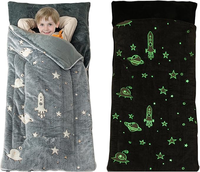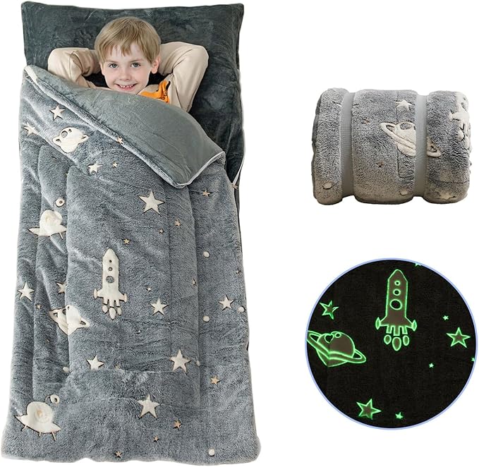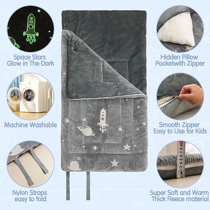 - 【Mesmerizing Glow-in-the-Dark Feature】The highlight of this nap mat for boys is the enchanting glow-in-the-dark blanket. With three captivating designs - Gray Space, Pink Gradient Unicorn, and Rainbow Striped Unicorn - the patterns come to life when exposed to sufficient light sources, creating a mesmerizing and magical sleeping environment.
