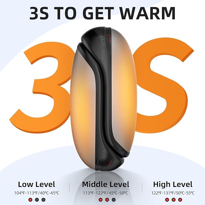 - [3S to Get Warm] -- Fast heating to get warm in 3s,3 temperature setting from 104℉ to 131℉, Not only can it warm your hands and ward off the cold, but it can also be used for heat therapy to alleviate pain and prevent chilblain