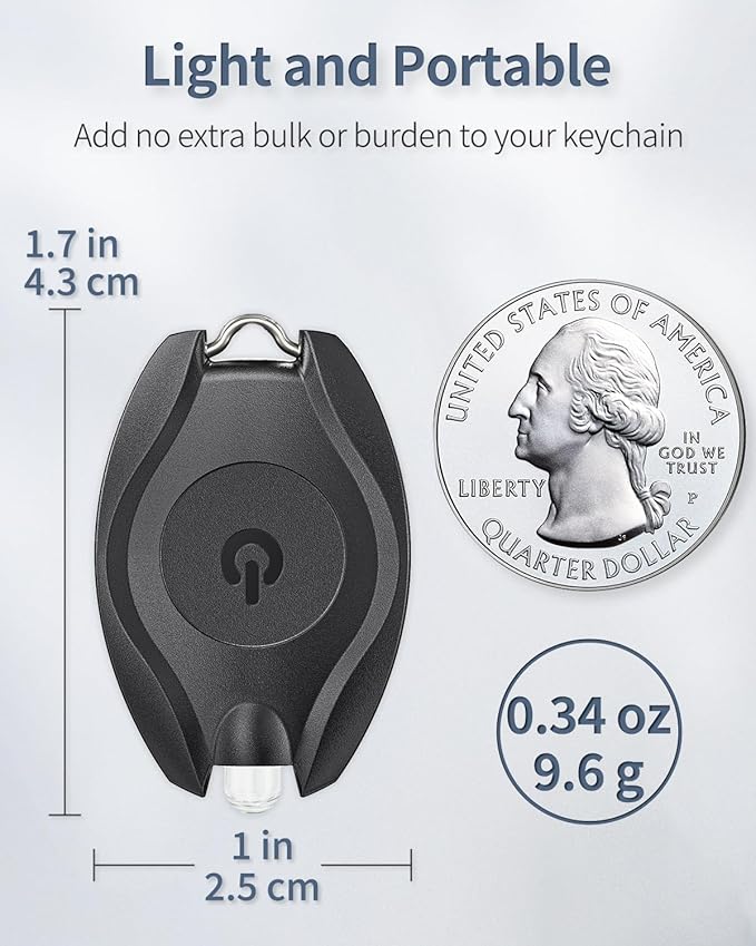 - Light & Portable: Size: 1.7" L x 1" W; Weight: 0.34 oz. Easily attach the mini LED light to your keychain with the split ring and carry it around wherever you like.