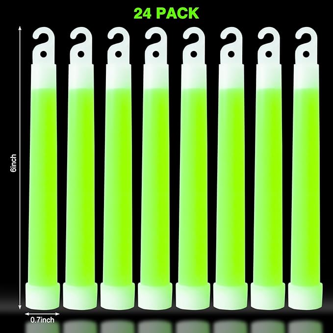 - 24 Pack Bright Glow Stick: There are 24 green glow sticks in total, the glow sticks are 6 inches long, there are plenty of them, you can use them in camping, hiking, outdoor survival, power outages and other emergencies, and you can also share the joy with your friends at a party!