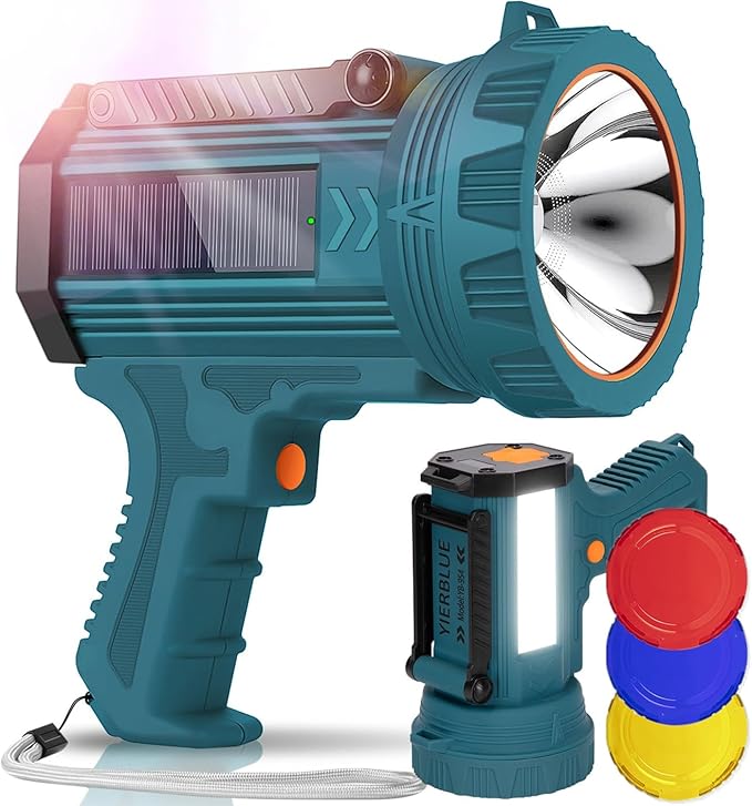 YIERBLUE Solar Power & Rechargeable Spotlight Flashlight, 1000,000 High Lumen Outdoor Handheld Spot Light and Flood Side Light, with Foldable Stand and 3 Colors Lenses for Boating Hunting and Camping