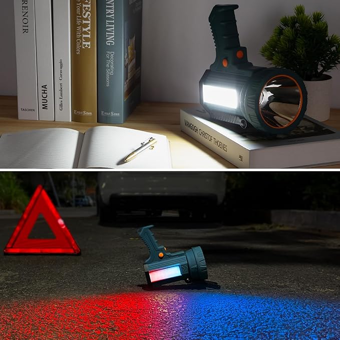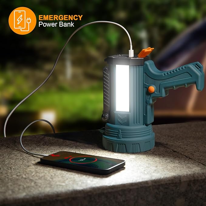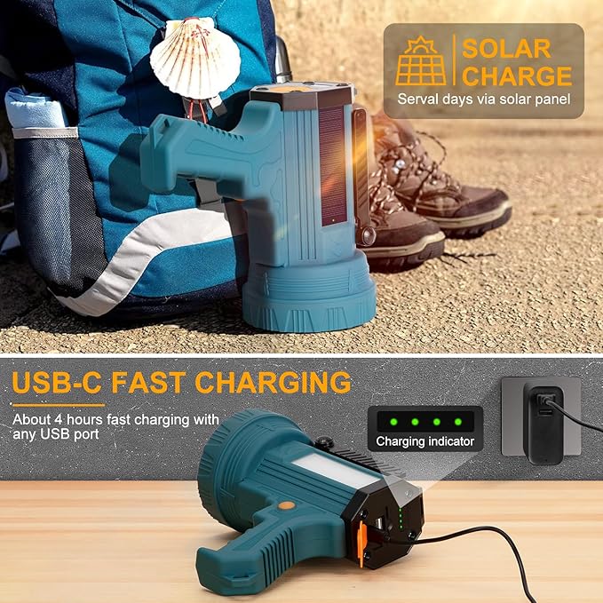 - USB C FAST CHARGING & SOLAR POWER: With advanced USB-C charging technology, recharge in just 4 hours. Compatible with any USB charging port, you can charge this handheld spotlight at home or in your car (charging adapter is not included). The high-efficiency solar panel can always replenish the power of the flashlight in time, so there is no need to worry about long-term power outages or battery power being exhausted.
