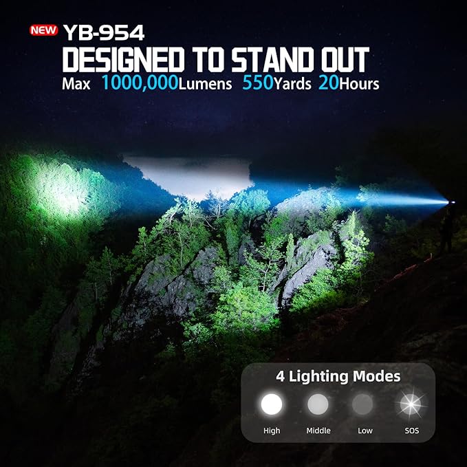 - HIGH BRIGHTNESS SPOTLIGHT FLASHLIGHT: Made of superb LED, the main beam gives out brightness up to 1000,000 lumen(max) with a long illumination distance of 550 yards/2600 feet. LEDs boast an extended 50000-hour lifespan. Features 4 adaptable settings: High/ Middle/ Low/ SOS(Long press 3 seconds). it’s far superior to many higher-priced spot lights and large flashlights.