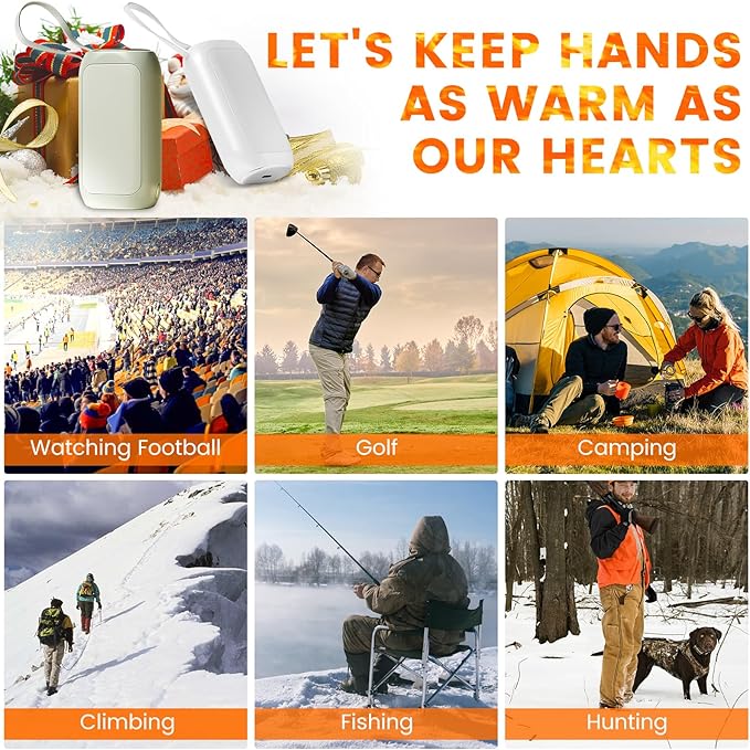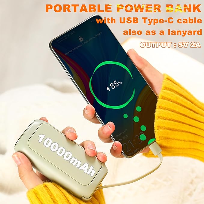 - 【As a Power Bank & Small in Size, Easy-pack and Go】The Portable hand warmers’ design with a USB Type-C 5V 2A output data cable, it can not only as a power bank, charge your phone, iPad, and other devices at any time, such as charging the iPhone 14 for 20 minutes and using it for 1 hour, but also be used as a lanyard, small and portable. allows it to fit into pretty much any pocket, glove, bag to keep you warm when you’re in the cold. It's the perfect partner to fight off the freeze.