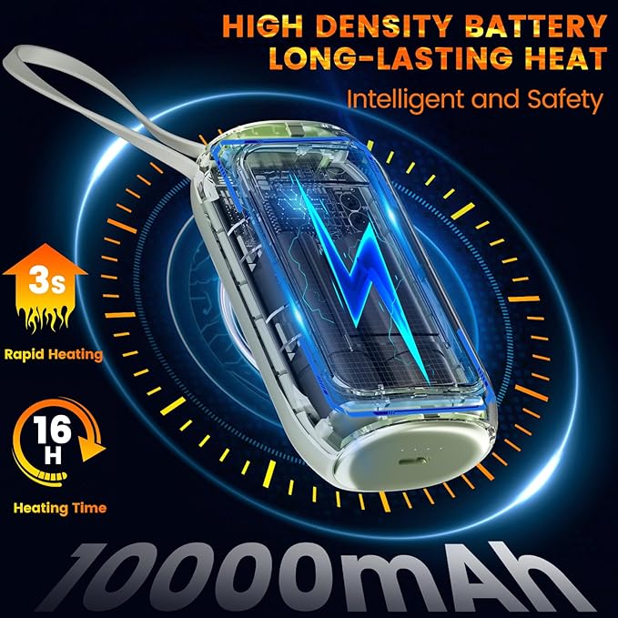 - 【8-16 hrs Using time & 𝐂𝐥𝐞𝐚𝐫 𝐒𝐭𝐚𝐭𝐮𝐬 𝐈𝐧𝐝𝐢𝐜𝐚𝐭𝐨𝐫】The 10,000mAh Rechargeable hand warmer offers you with up to 8-16 hours of warmth in cold winter(Low 113°F/16Hrs, High 131°F/8Hrs), outpace your mates. Avail a healthy heat transfer with 4 indicator lights that inform you of the remaining battery.