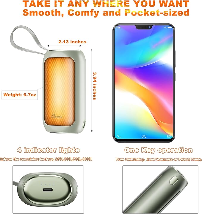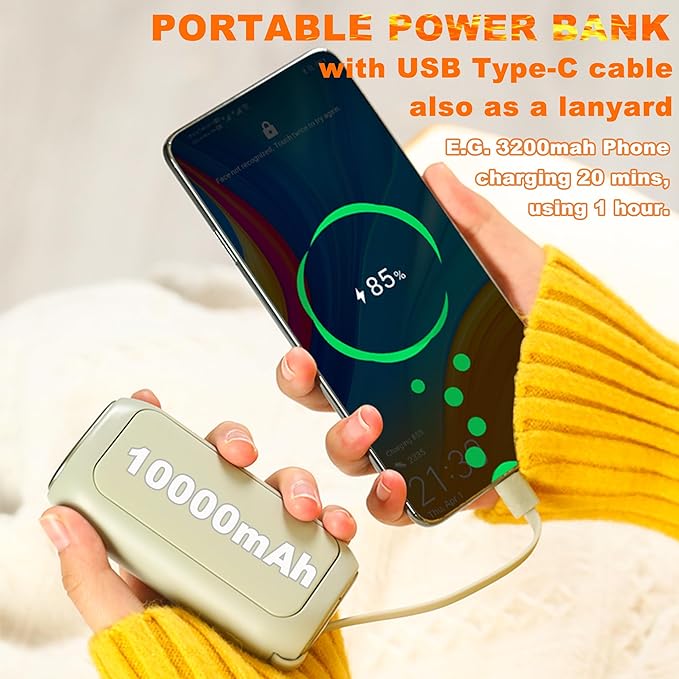 - 【As a Power Bank & Small in Size, Easy-pack and Go】The Portable hand warmers’ design with a USB Type-C 5V 2A output data cable, it can not only as a power bank, charge your phone, iPad, and other devices at any time, such as charging the 3200mAh Phone for 20 minutes and using it for 1 hour, but also be used as a lanyard, small and portable. allows it to fit into pretty much any pocket, glove, bag to keep you warm when you’re in the cold. It's the perfect partner to fight off the freeze.