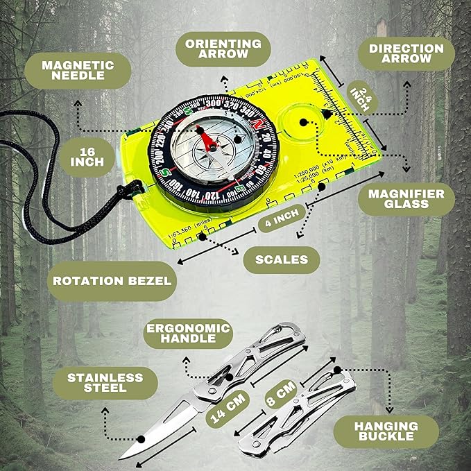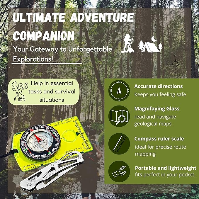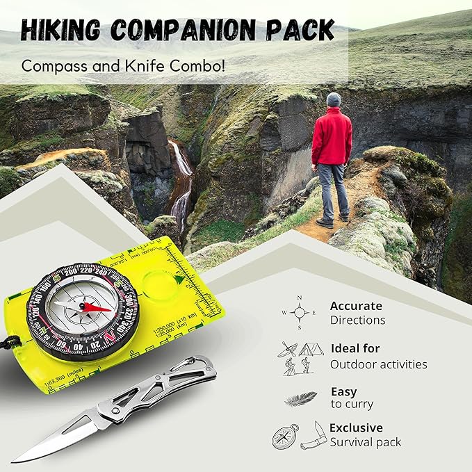 • IMPRESSIVE FEATURES: Both Compasses come with a non-magnetic Acrylic Baseplate to not intwith the magnetic needle, and have the best accuracy. The needle is placed in a bubble that allow the needle to have a quick 360 degrees rotation helping us to have a accurate and fast reading of the direccion the we have to take. Its differents Ruler Scales help the hiker to read the map more accurate. It also has a Magnifying Glass that help us to read geological maps and small details of the map.