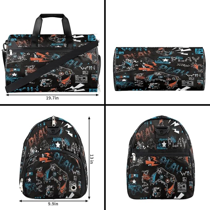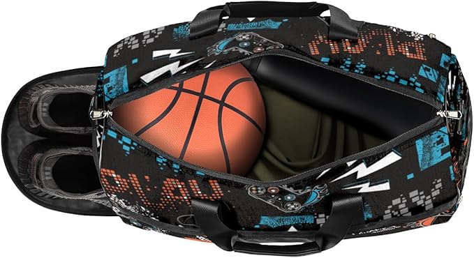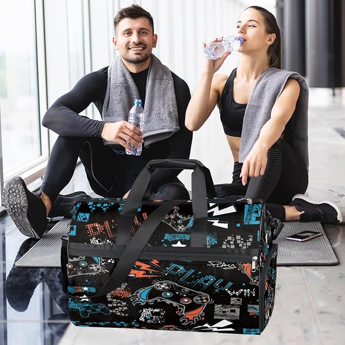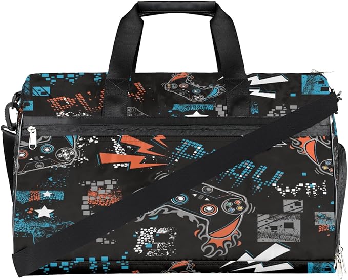 Joystick Game Dry Wet Depart Duffle Overnight Bag with Shoes Compartment & Wet Pockets, Doodle Water Resistant Weekender Travel Gym Pouch For Swim Gymnastics Ballet Sleepovers