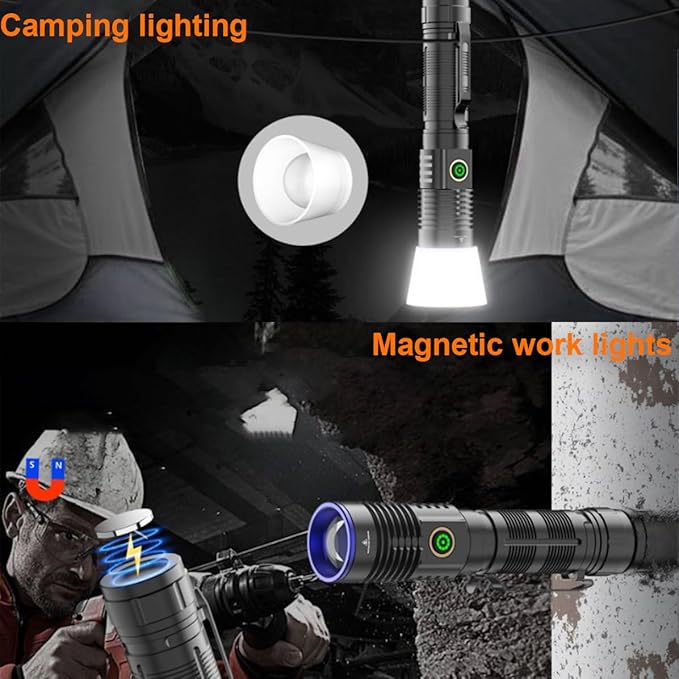 - 【LED Flashlight Work Light with Magnet】LED flashlight designed with a strong magnetic base, you could magnet this torch to any iron surface, totally let you hands free when you need do some repair working at night, emergency car inspection or power outage at typhoon weather.
