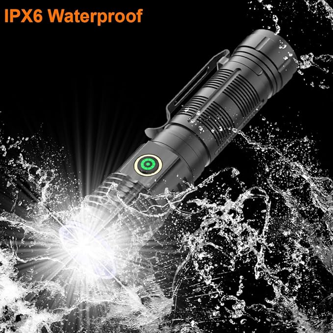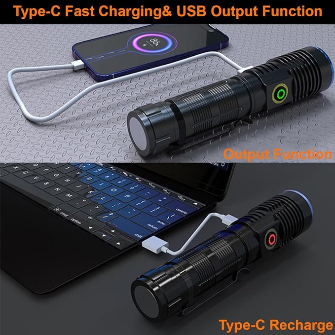 - 【USB-C Rechargeable LED Flashlight & Power Bank Function】 This rechargeable flashlight is equipped with a high capacity rechargeable battery, works for up to 10hours with full charge. The USB-C port ensures high efficiency charging, only takes 3-4 hours to fully charge. With USB output designed, it can also be used as a power bank to charge your mobile phone when in emergency.