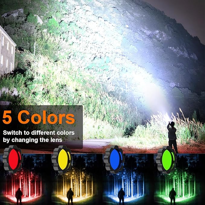 - 【Multi-Color Filters for Different Using Purpose】This multi-functional flashlight includes Red, Green, Blue, and Yellow lenses for versatile applications, such as green red light hunting, preserving night vision, tracking, and signaling.