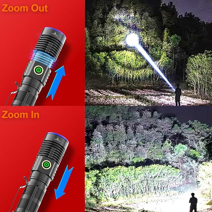 - 【200000 Lumen Super Bright Flashlight Zoomable】Equipped with a super bright 20W high power LED chip, producing up to 200000 lumens brightness. It can easily illuminate a room up to 1,000 square feet or focus on objects up to 2,624 feet away. Adjustable focus function makes it work as floodlight for wider area when zoom in or spotlight for longer distance when zoom out by stretching the top of the tactical flashlight.
