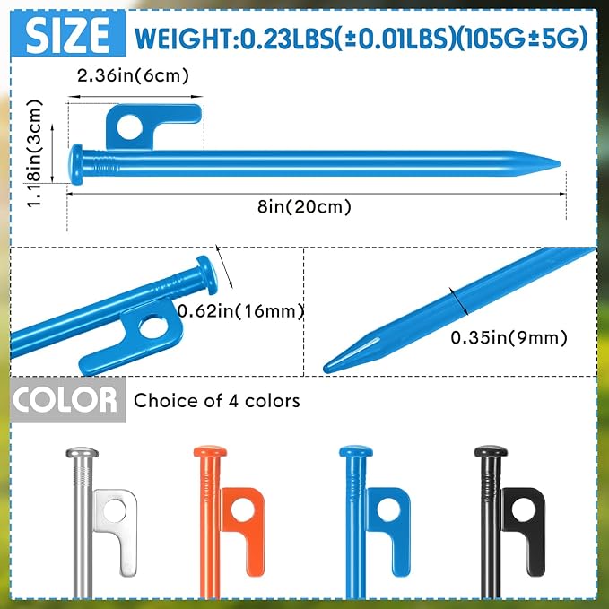 - Practical Size: about 8 inch/ 20 cm, which is long enough to get deep into the ground for a secure hold, these metal stakes for ground are easy to spot against various ground surfaces, ensuring that they will fit your camping bags without taking too much space