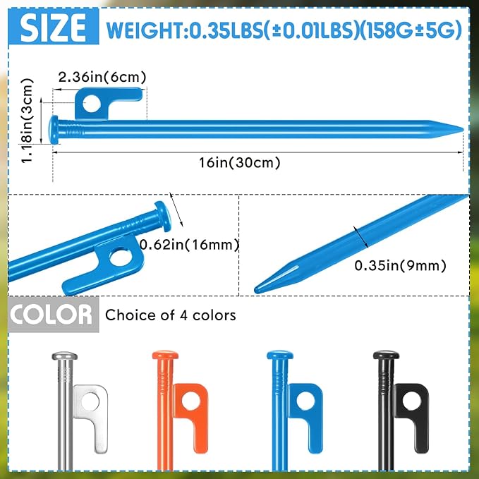 - Practical Size: about 12 inch/ 30 cm, which is long enough to get deep into the ground for a secure hold, these metal stakes for ground are easy to spot against various ground surfaces, ensuring that they will fit your camping bags without taking too much space