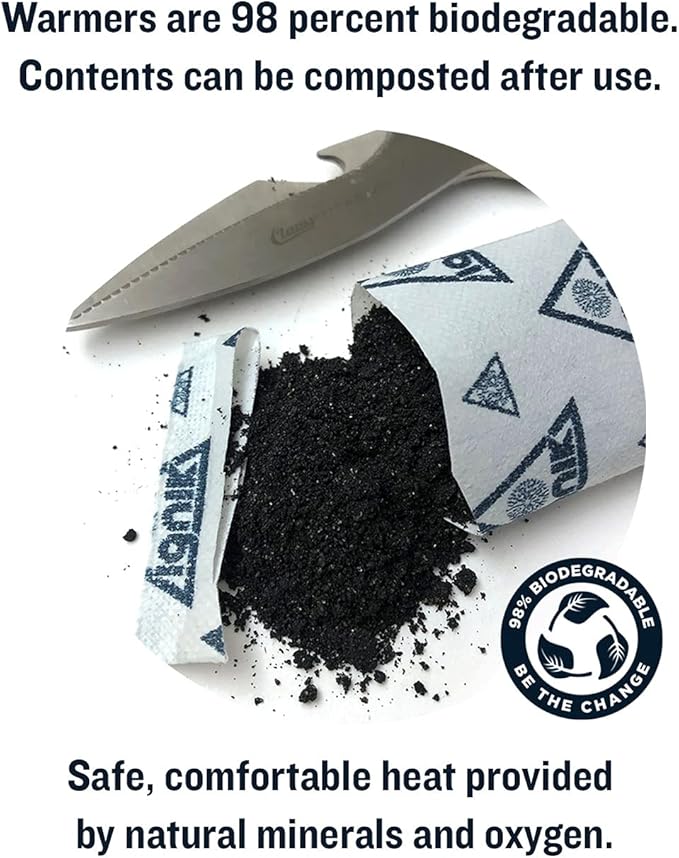 - Warmers are 98 percent biodegradable (contents can be composted after use); safe, comfortable heat is provided by natural minerals and oxygen