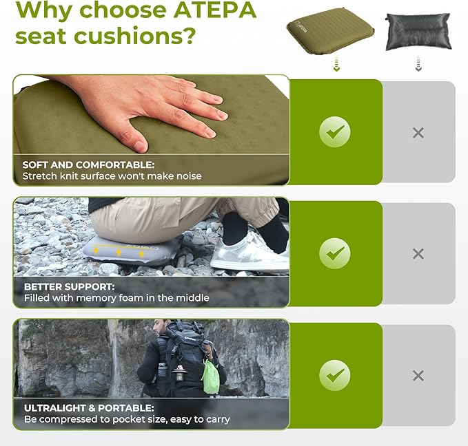 ATEPA Inflatable Seat Cushion Lightweight Self-Inflatable Memory Foam Seat Cushion for Stadium Airplane Trevel, Waterproof Portable Seat Cushion Best for Backpacking Camping Chair Pad, Olive Green
