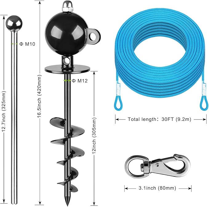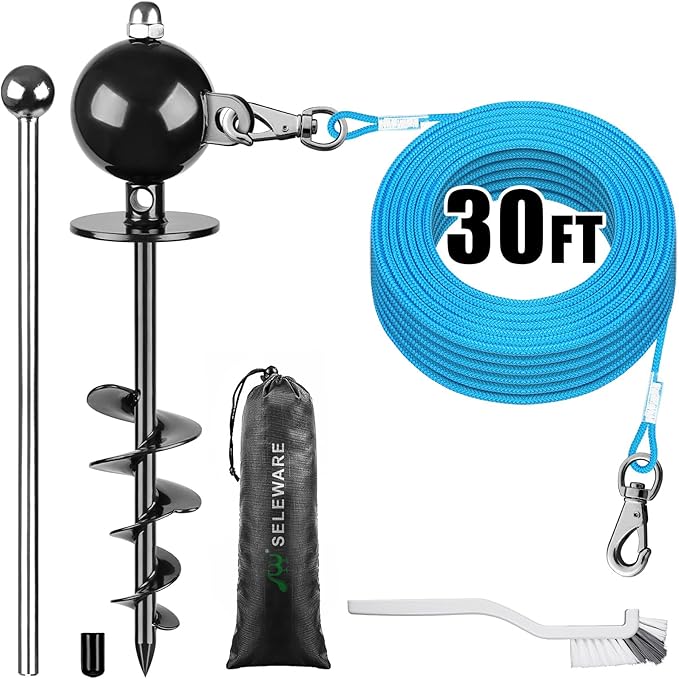 SELEWARE Dog Tie Out Stake Outdoor Anti-Rust Dog Anchor for Large Dogs up to 220 lbs Tie Out Rope Dog Leash 30 ft Long