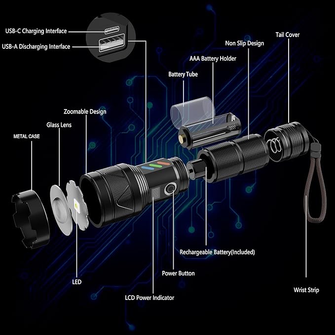 - [MULTI-FUNCTIONAL 2 IN 1 - FAST USB C CHARGING & DISCHARGING FUNCTION] The handheld LED flashlight high lumens rechargeable is built-in 2 USB interfaces, one is USB C input for charging, the other is USB output which can charge your smartphone, earphone or any other USB devices, it is convenient to get charged in indoor or outdoor activities.