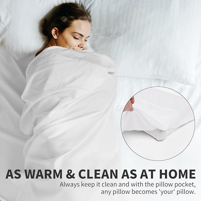 - BACK PILLOW POCKET: Are you still worried about sleeping on unclean sheets and feeling uncomfortable all over? The sleeping bag liner is comfortable and soft, a lifesaver for those with sensitive skin. The innovative design places the pillow compartment on the back to avoid contact with the pillow, keeping it clean and tidy, allowing you to have a good night's sleep