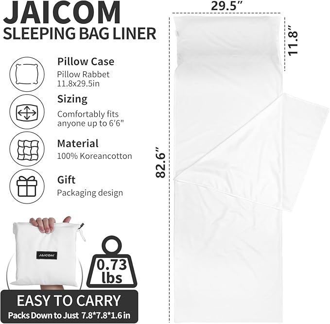 - ULTRA-LIGHTWEIGHT AND PORTABLE: The sleeping bag liner is very compact, weighing only 0.73lbs and measuring 7.9 x 7.9 x 1.4 in when packed. It can be easily stored in a backpack or suitcase without any burden. The product size is 82.7 x 29.5 in, and the larger size design makes the interior space very spacious, suitable for people of all body types