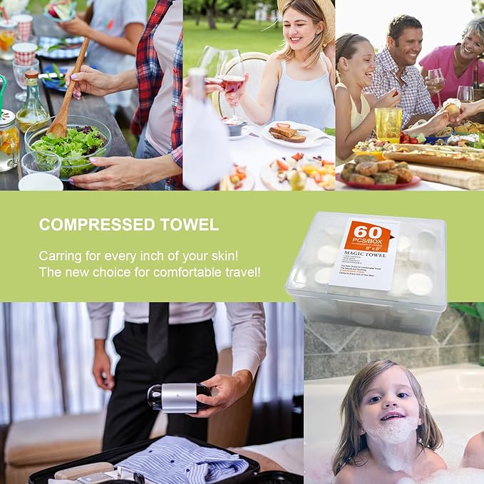 - Packing list: In box total have 60pcs compressed towel tablets. Hygiene: The Travel Facial Towels are disposable, ensuring hygiene and cleanliness, especially when traveling or participating in outdoor activities.