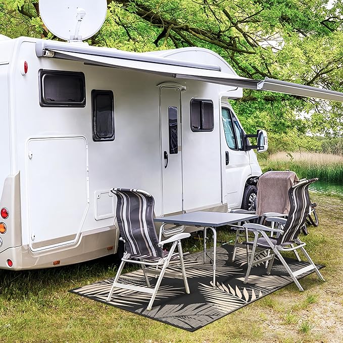 - Perfect Choice For RV Camping: Woven from lightweight plastic straws, these RV outdoor rugs can be easily folded down to a compact size to fit in our included carry bag. This portable waterproof outdoor rug allows you to take it outside easily, and also designed 4 corner loops with 4 stakes to help fix the carpet in place. Using this camper rug will relieve all the burden and fatigue of your RV trips and camping, allowing you to have plenty of imaginable space for more fun