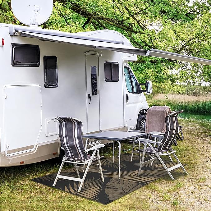 - Perfect Choice For RV Camping: Woven from lightweight plastic straws, these RV outdoor rugs can be easily folded down to a compact size to fit in our included carry bag. This portable waterproof outdoor rug allows you to take it outside easily, and also designed 4 corner loops with 4 stakes to help fix the carpet in place. Using this camper rug will relieve all the burden and fatigue of your RV trips and camping, allowing you to have plenty of imaginable space for more fun