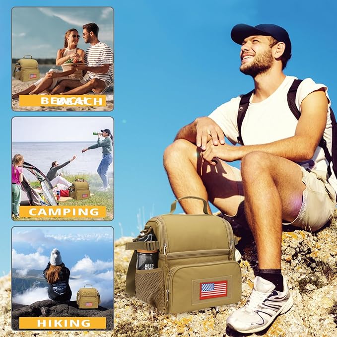 ATRIPACK 2 Compartment Lunch Bag for Men Adult, Tactical Lunch Box Leakproof Insulated Large Cooler Bag for Work with Adjustable Shoulder Strap Flag Double Layer Lunch Pail(Brown)