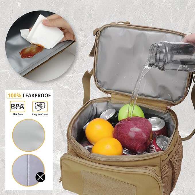 - MULTIPLE POCKETS: Lunch bag men has 2 main storage section; 1 front zipper pocket for utensils, napkins, keys, cards and other small stuffs; 2 sides mesh pocket for the things need easy access. A patch in the front pocket area can patch different patches you like. The rear molle belt also allows it to be attached to your larger backpack, Designed for conveniently attaching storage pouches, keys, carbines, sunglasses, knife.