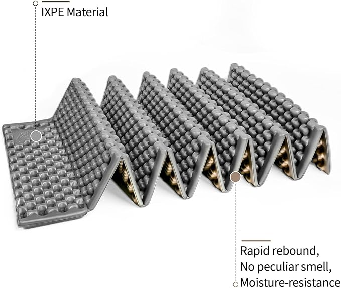 • 【Peanut Shape and Space Saving】Camping foam sleeping pad for camping features Peanut shape design and accordion-style design. Peaks and valleys work together to reinforce support capacity and trap nest one to another inside to save space when packed.