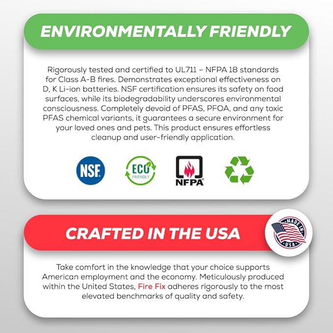 - Environmentally Conscious Design: Our wetting agent undergoes rigorous testing to meet UL711 – NFPA 18 standards for Class A-B fires. It demonstrates exceptional effectiveness on D, K Li-ion batteries and holds NSF certification for safe use on food surfaces. With its biodegradability and exclusion of PFAS, PFOA, and toxic PFAS chemical variants, rest assured it provides a secure environment for your loved ones and pets. Enjoy effortless cleanup and user-friendly application.