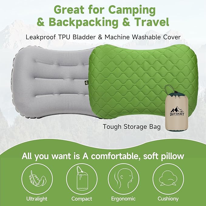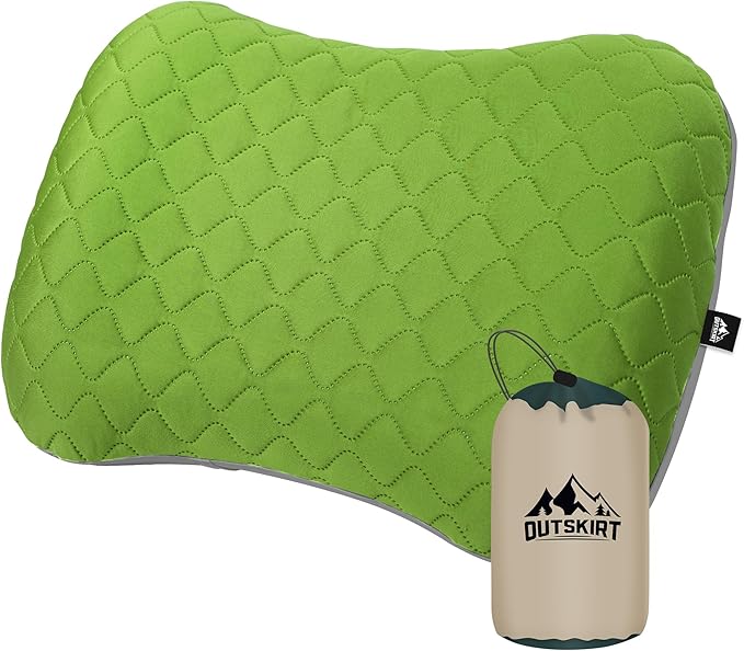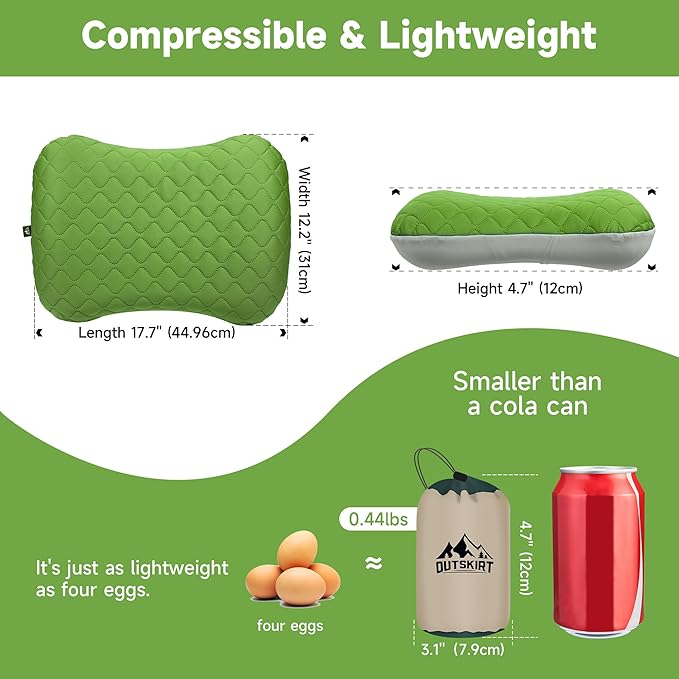 OUTSKIRT Inflatable Travel Pillow, 2-in-1 Camping Pillows for Sleeping, Ergonomic & Lightweight Small Backpacking Pillow for Travel, Hiking, Camping & Outdoor Activities, Green