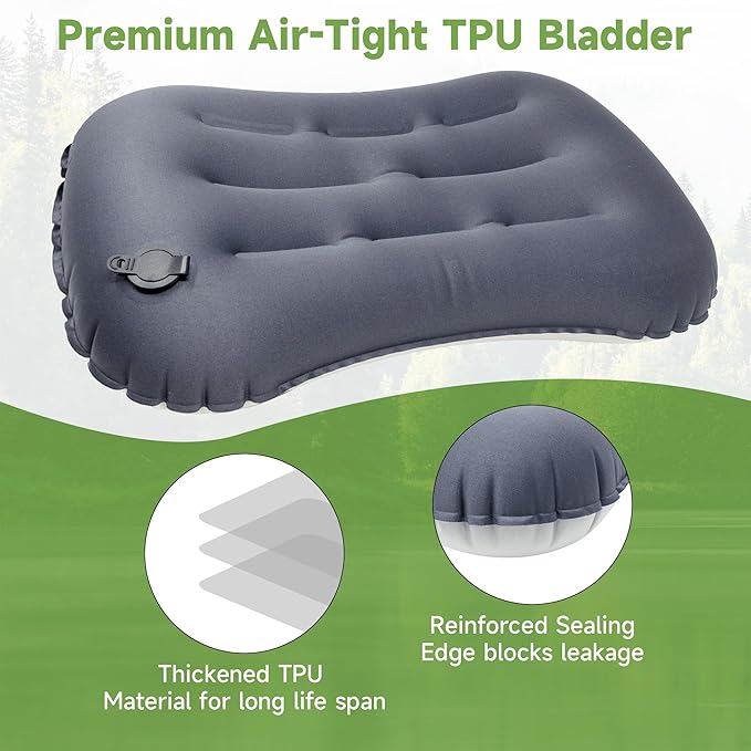 - 【EXCELLENT DURABILITY & NON-SLIP DESIGN】 No more air leaks from this inflatable camping pillow. Comes with a separate bladder made from thickened TPU material which prevents air leaks effectively. The extra removable elastic strap will prevent the inflatable air pillow for camping from moving around while sleeping.