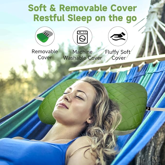 - 【SOFT & REMOVABLE WASHABLE COVER】 More comfortable with a soft and removable pillow cover. To provide a better camping sleeping experience, this inflatable pillow cover is made of soft, skin-friendly and breathable fabric. Also the cover could be simply removed and washed for easy care.