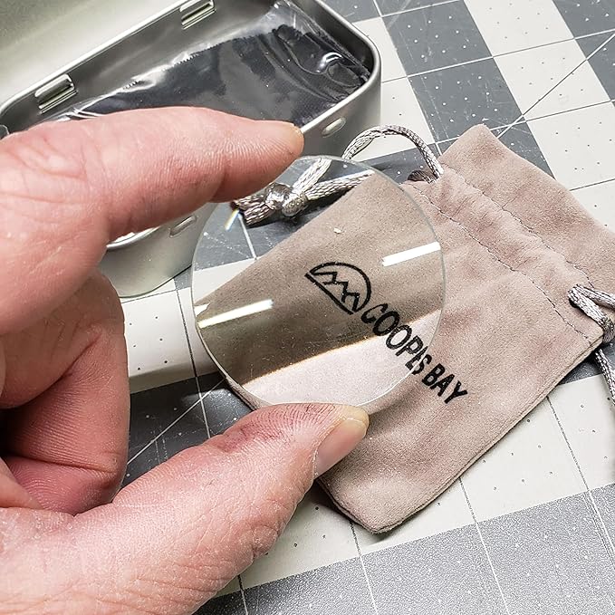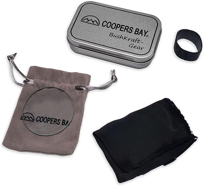 Lens Burning Fire Starter Kit - Includes Glass Magnifying Lens, Char Cloth & Metal Storage Tin