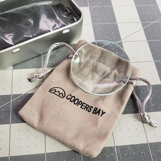 - Lens burning kit includes a glass magnifying lens, char cloth, and metal storage tin.