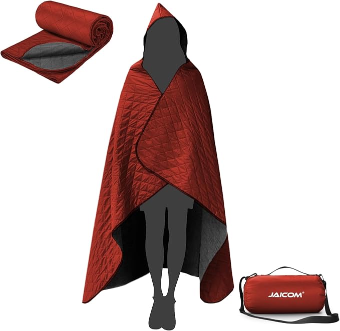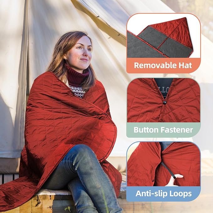 - HOODED BLANKET DESIGN: Our stadium blanket is designed with convenient buttons and a rain-proof hood that easily transforms into a hooded blanket on rainy days, effectively keeping the rain and wind out and your body dry and warm. Plus, with the ability to combine two blankets together, you can create an extra-large blanket measuring a spacious 110" x 79" Whether you're enjoying the great outdoors or snuggled up indoors, our blanket is the perfect companion for any adventure.