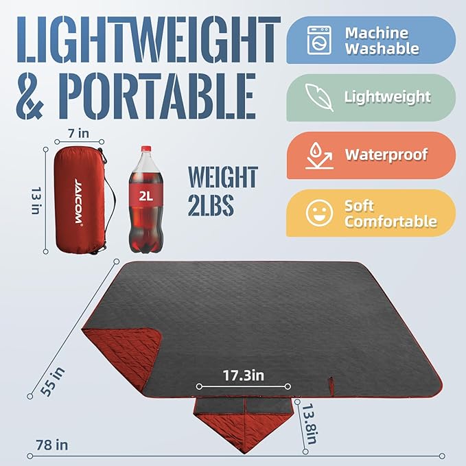 - MULTIPLE SCENARIOS: Experience the versatility of JAICOM picnic blankets, perfect for any scenario, all year round. Whether you're lounging on the beach, soaking up the sun and sea breeze, or keeping warm around the campfire, our blankets are designed to provide maximum comfort and convenience. Enjoy a cozy picnic with your loved ones on the grass, or simply drape it over your sofa to protect against stains.