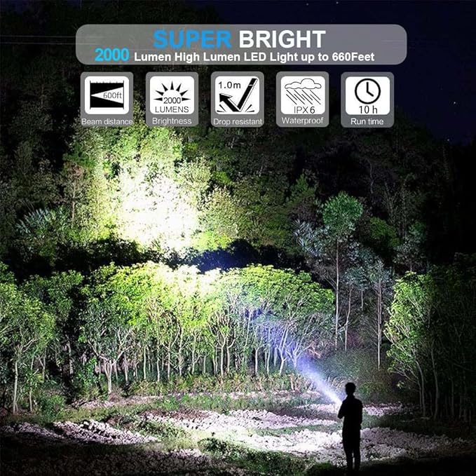 - Super bright LED Rechargeable flashlight, 2000Lumen, 4Modes: Bright Rechargeable Flashlight delivery a high output 2000 Lumen Max that the beam distance can be up to 600ft, zoomable function help this Magnetic LED Flashlight can be fully zoomable from large area floodlight to focused spotlight; Tactical Flashlight have 4 Modes:High / Low / COB SOS/ COB sidelight modes ,SOS mode keep you always safe in any emergency situation.