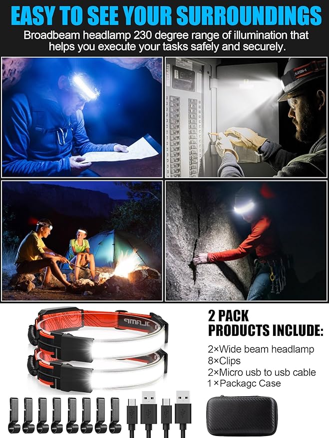 - 230°Wide-Beam Illumination ---The construction headlamp provides 230° angle wide area illumination instead of lighting up only a small area in front of you. The broadbeam is most fit to human eyes, ensures you can see everything in your vision, don’t have to move headlight to illuminate the desired area, user-friendly.