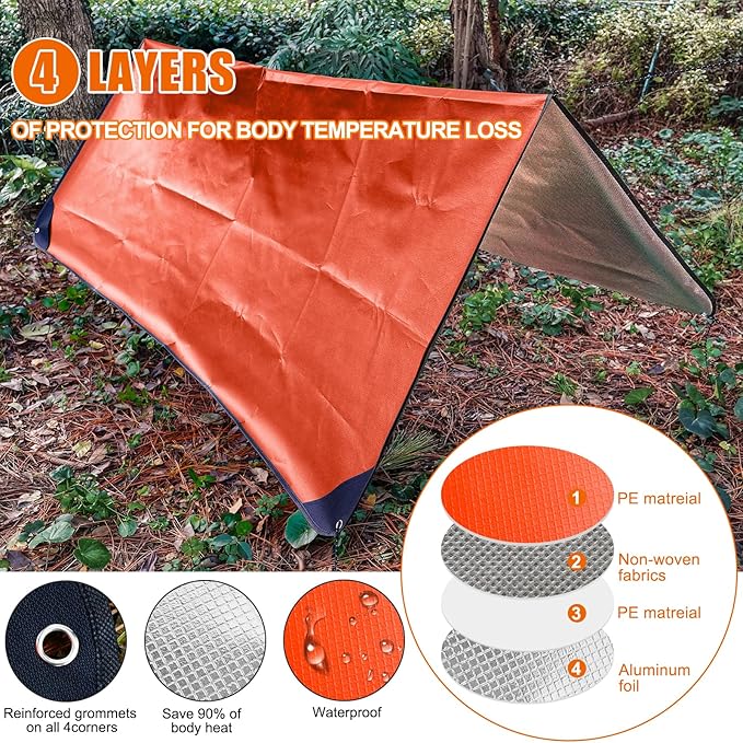 - 【4 Layers of Protection】This reflective emergency survival blanket is waterproof, windproof and has excellent heat retention. Made of non-woven fabric and polyester mesh combined with aluminum mylar coating. Better thermal insulation, more durable and less prone to damage than traditional single-layer mylar survival sleeping bag