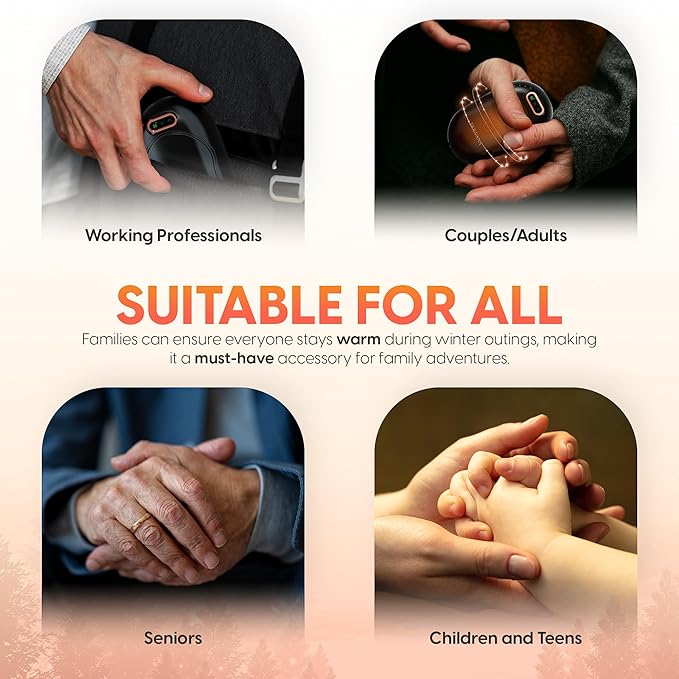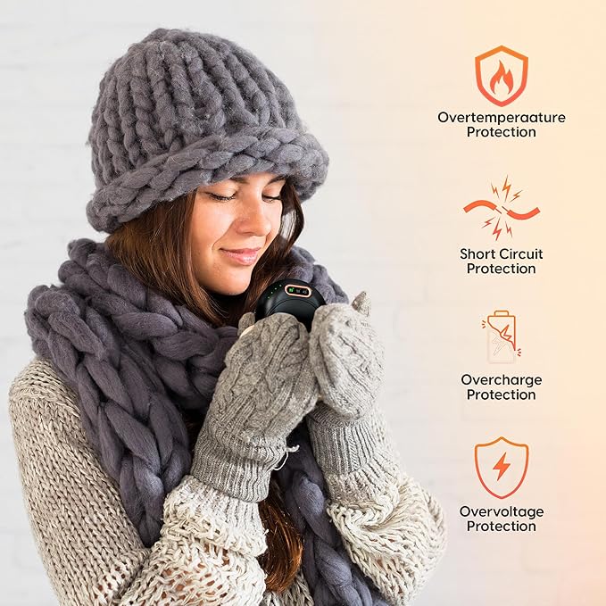 - Rechargeable and Safe: These camping hand warmers come with a built-in 5000mAh battery which is fully rechargeable and provides an autonomy of up to 16 hours of use. With multiple protection features, our handwarmers prevent overvoltage, over temperature, short circuit, overcharge, over discharge and overpower, for a safe user experience.