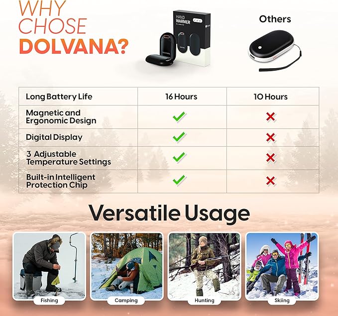 - The Perfect Solution: The DOLVANA rechargeable hand warmers are an excellent choice for outdoor enthusiasts who want to maintain their hands warm even during extreme winter temperatures, being ideal for hunting, camping, hiking, fishing trips, nature exploring and more!