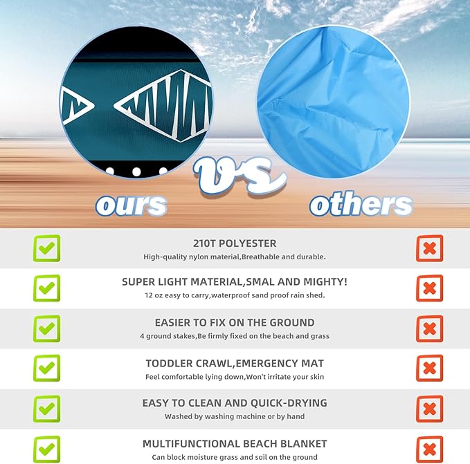 - 🏕️Beach Blanket Oversized:Good tear resistance,dry quickly.Can also be used as a rain shed,sunshade,tent,toddler crawl,emergency mat.Feel comfortable to lying down.Won't irritate your skin,better professional fabric sewing.