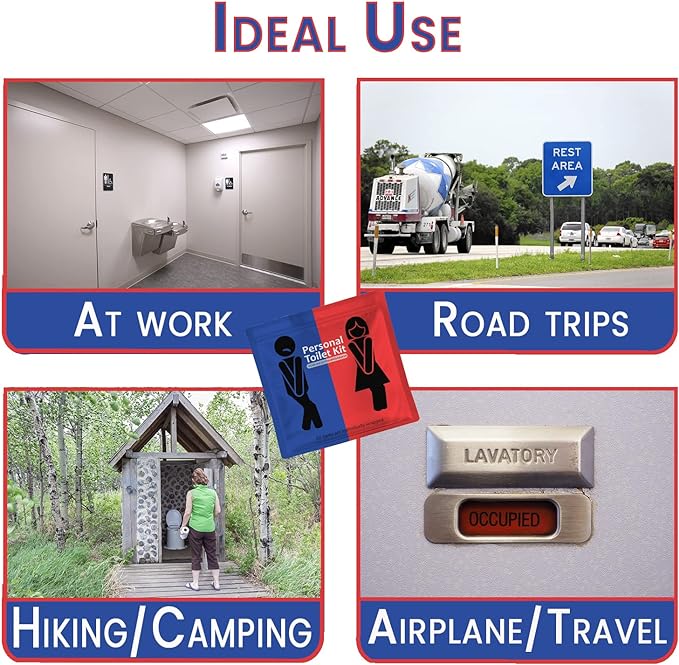 - On the Go Bathroom Kit: Perfectly designed for outdoor enthusiasts, this packable and portable kit provides everything you need for bathroom emergencies during hiking, camping, or any travel activities.