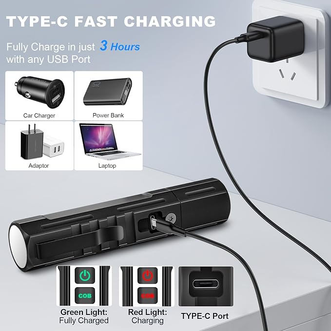 - 【TYPE-C FAST CHARGING & EMERGENCY FLASHLIGHT】This rechargeable led flashlight has a built-in TYPE-C fast charging port, while offering more compatibility and faster charging than Micro USB, only need 3 HOURS to get the fully charged. Equipped with a TYPE-C cable, can be charged by any USB port, such as adapters, laptops, car chargers, power banks, etc. When there is a sudden power outage at home or an emergency outdoors, the flashlight can also be used as an emergency light.