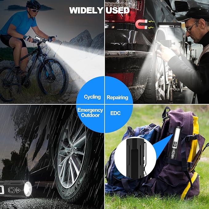 - 【TAIL STRONG MAGNETIC FLASHLIGHT & COB SIDE LIGHT】The strong magnetic function is build in the tail of the led rechargeable high lumens flashlight, which can be adsorbed on the surface of iron metal at will, liberating hands anytime and anywhere. COB sidelight is another option for your large-area lighting at night. And can be used as maintenance, work lights or home emergency backup lights.