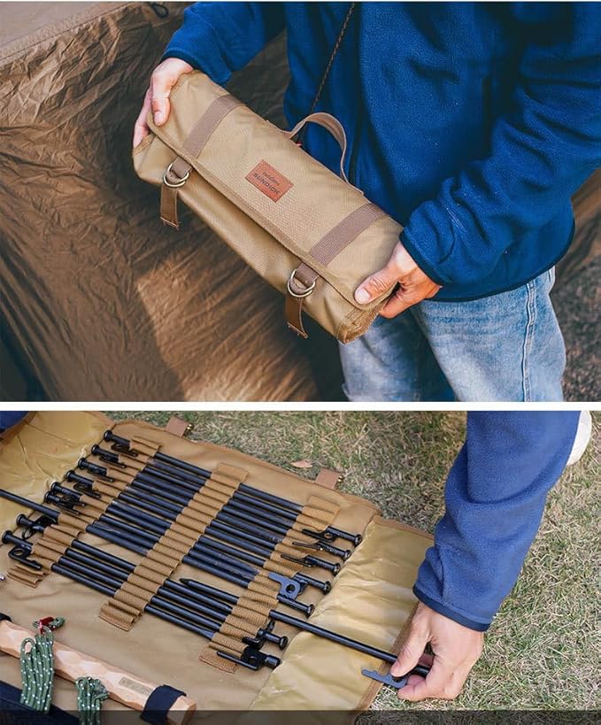 - **Robust Durability** : Crafted from superior 600D double-layer Oxford fabric, our storage solution boasts a reinforced design that safeguards your equipment, offering unparalleled protection for both stakes and hammer against rough outdoor conditions.