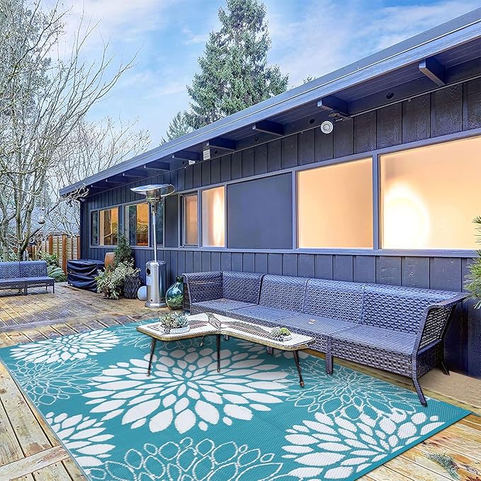 Ileading Reversible Outdoor Rug 5x8Ft Waterproof Patio Rug Carpet Portable Outdoor Plastic Straw Rug Large RV Camping Mat Rug for Patio, Clearance, Deck, Beach, Porch, Camping, Picnic, Flower Teal