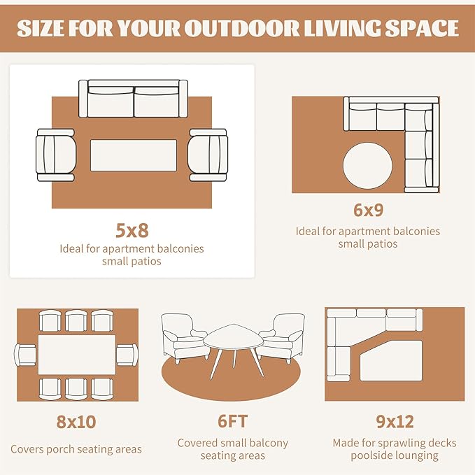 - Waterproof & Easy Cleaning: The outdoor/indoor rugs are water proof and easy to clean. Our rugs resist lots of stains: milk, wine, cola, grass and more. Simply sweep away dirt with water and the breathable design make it possible to airing dry in few minutes. If you are outside without water, you can just wipe it with cleaning cloth or shake it, rid the dust off. Great for keeping dogs out of the dirt.